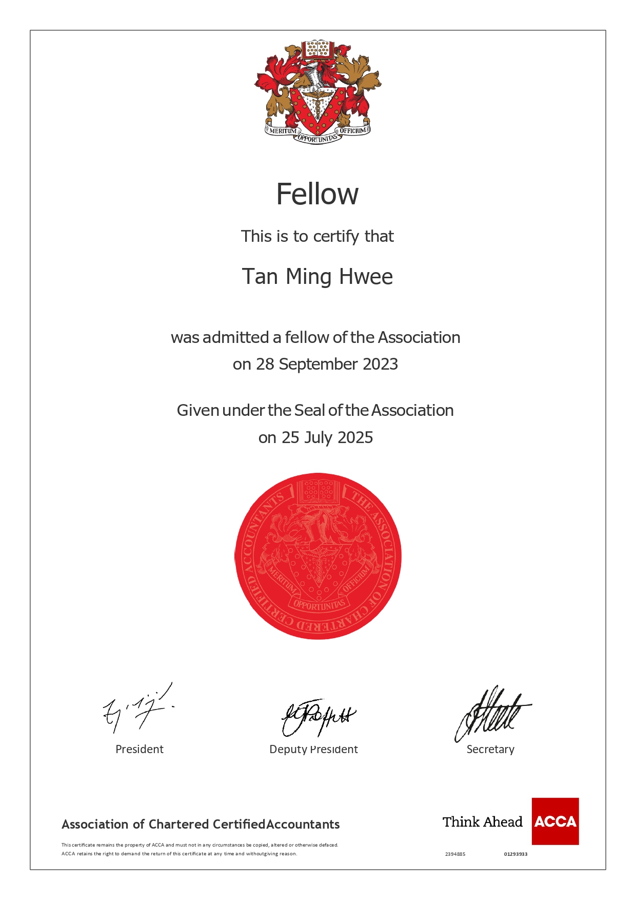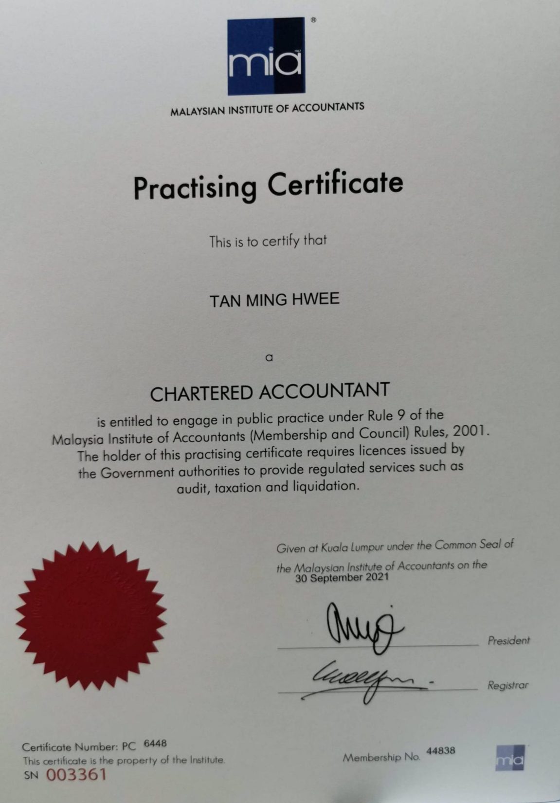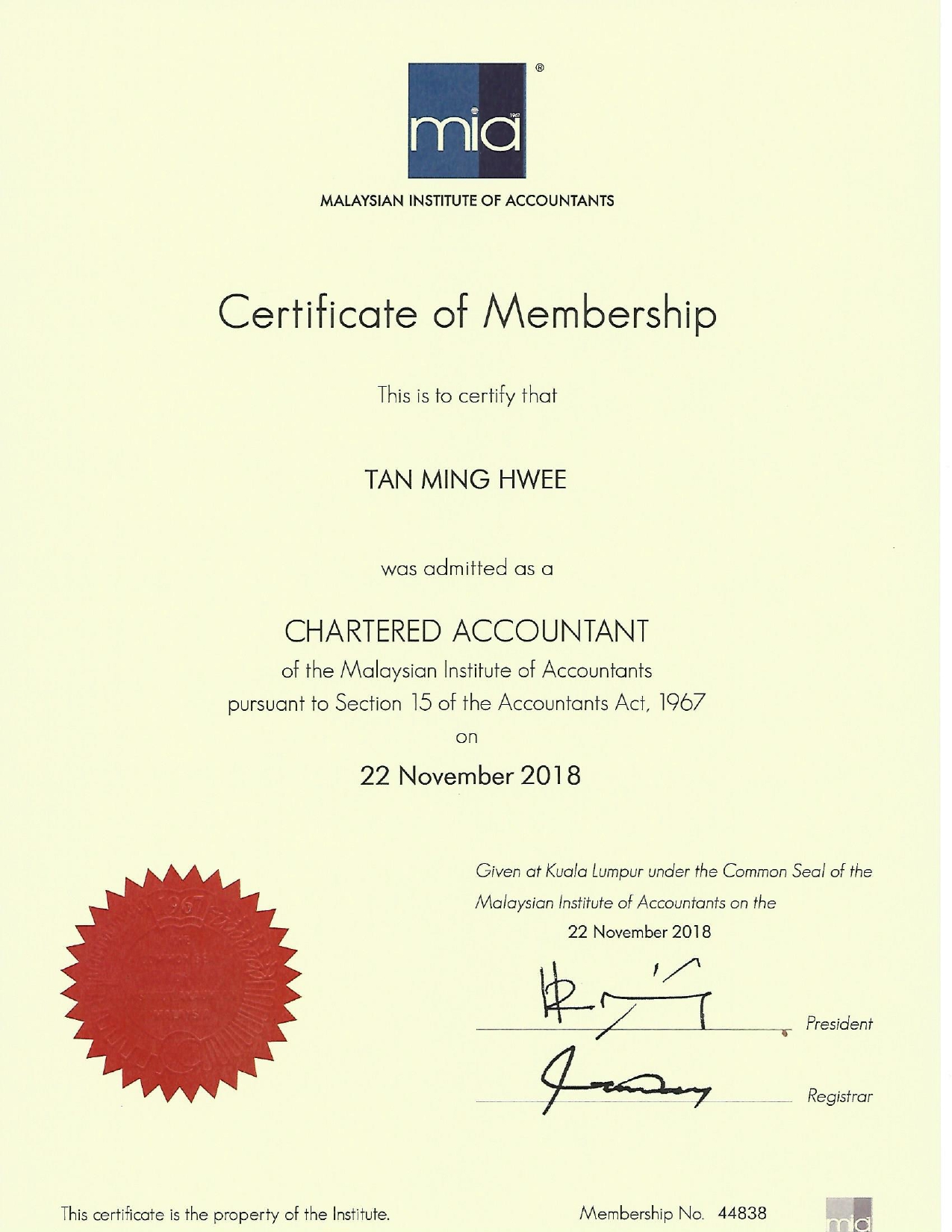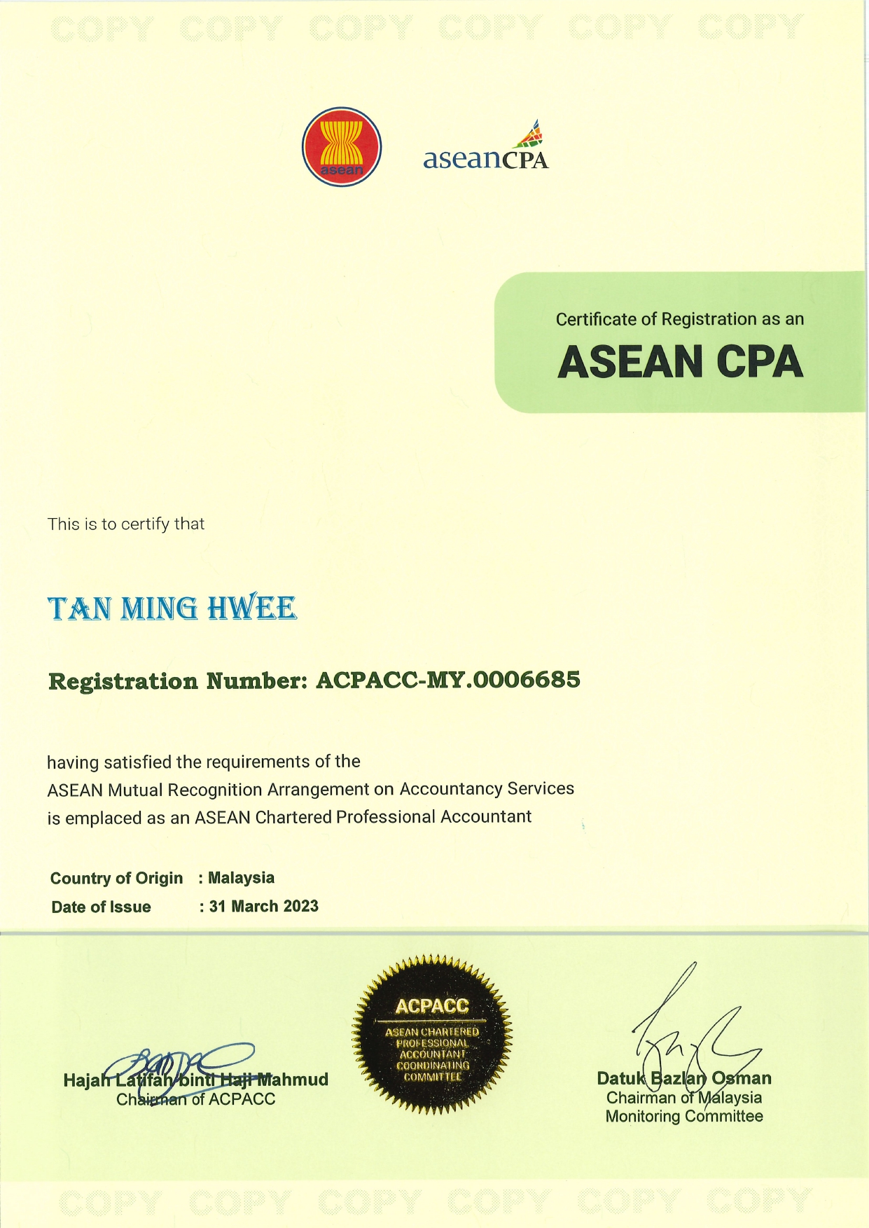 Managing Director – FCCA, MIA, ASEAN CPA, Chartered Accountant (CA), ACTIM, Approved Tax Agent by Inland Revenue Board Malaysia